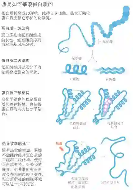 生命所必需的蛋白质通常具有十分精准的形态,它们以长链的形态开始,根据其分子序列,折叠成螺旋状、片状、或其他形状,这些形状在保证蛋白质的功能上发挥了巨大的作用。然而,当温度开始升高时,维持蛋白质结构的化学键会遭到破坏:先从较弱的开始,随着温度的升高,更强的化学键也不能幸免。这也解释了细胞为何缺乏耐热性。我们知道蛋白质结构的大面积损伤是致命的,但直到最近,我们才搞清楚过高的温度是否、以及如何杀死细胞的。