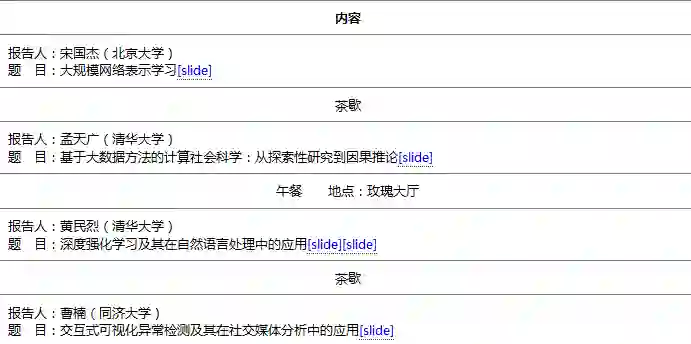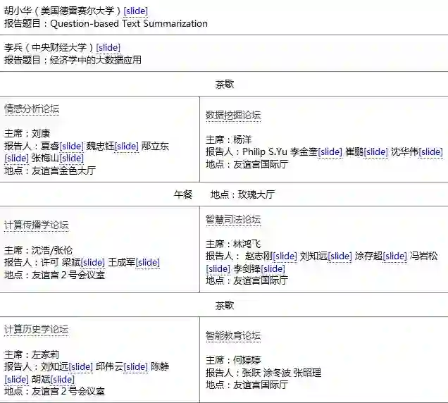据悉这次次大会邀请了多位国内外著名专家学者进行大会特邀报告,同时还邀请到智能金融、情感分析、计算社会学、数据挖掘、计算传播学、智慧司法、计算历史学和智能教育等领域的著名专家学者进行分论坛报告。