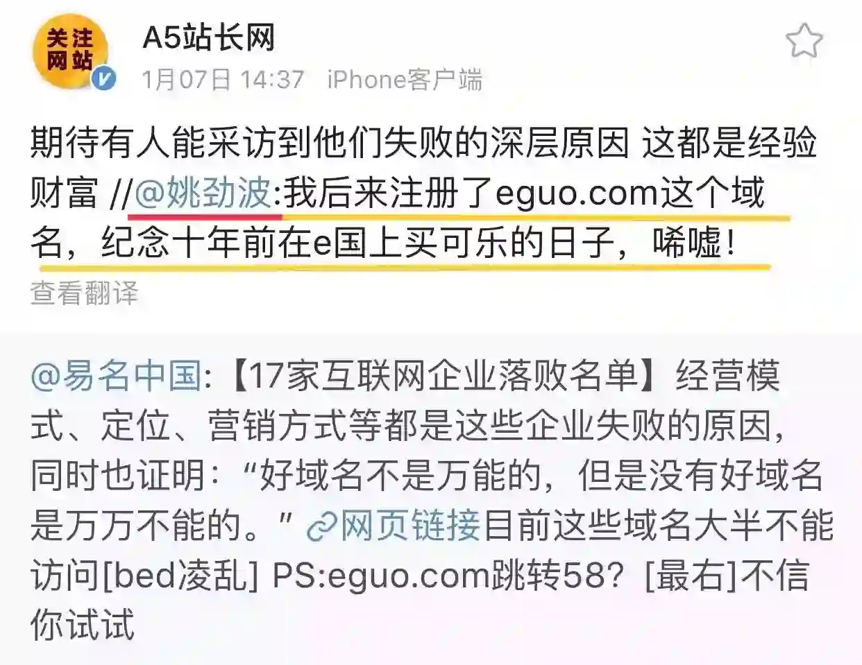 2001年,在烧掉了总共2.5亿美元后,Kozmo.com关张。同一年,另外一家承诺半小时配送的在线杂货店Webvan关张。至于e国,甚至都没人注意过它是什么时候消失的。2010年,e国的域名eguo.com被挂牌拍卖,报价仅为1.74万元。现在,这个域名属于58同城,因为58同城CEO姚劲波就是个曾在e国买可乐的e国用户。