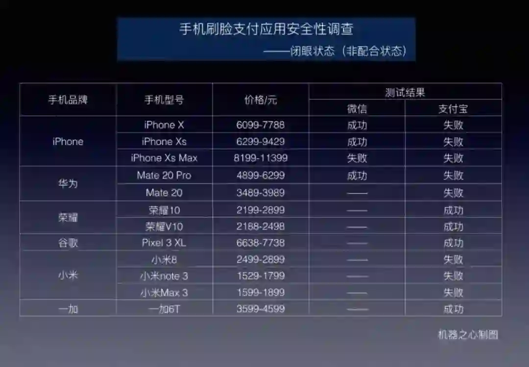我们的工作人员随机搜集到 13 位用户、12 款市场主流手机机型进行系统性测试,分别在微信和支付宝应用端,进行睁眼/闭眼状态下的转账支付实验。实验结果如下: