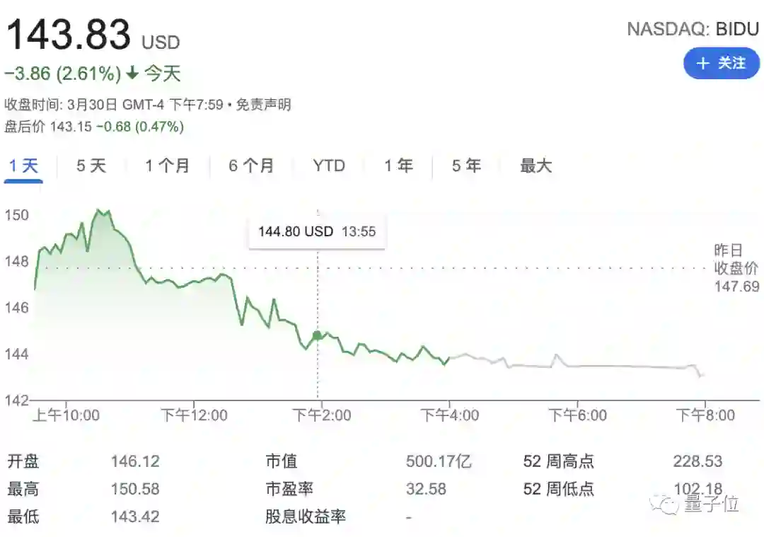 截止收盘,百度股价下跌2.61%。