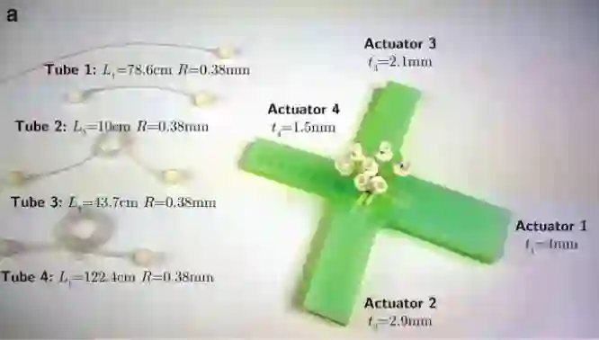 研究人员挑选了四条不同长度的管子,将四条管子分别接在机器人顶部的接口上,用管子的不同直径来控制气流通过机器人的速度,从而控制机器人的运动。不同的管子长度,不同的管子直径,甚至不同的接通方式均会对机器人的运动方式有所影响。
