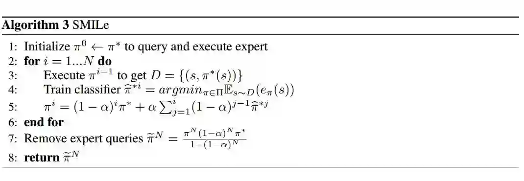 具体而言,我们从一个完全遵循专家行动的策略π_0 开始。在每次迭代中,我们训练一个策略π_i 以在以前的策略π_i-1 诱导的轨迹下模仿专家。接着,我们将新的训练策略添加到先前的几何折扣因子α(1 − α)^(i−1) 的策略混合中。因此,新的策略π_i 是 i 策略的混合,其中使用专家行动的概率为 (1 − α)^ i。算法 3 描述了 SMILe 算法。