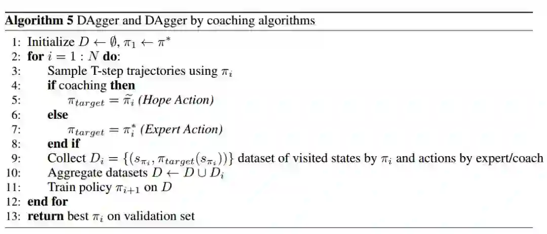 算法 5 描述了 DAgger 算法和 DAgger by coaching 算法。