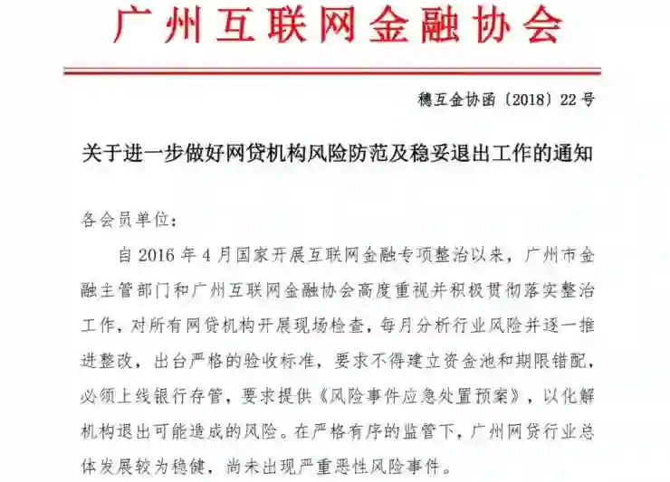 雷锋网AI金融评论消息,今日上午,广州互金协会官网发布《关于进一步做好网贷机构风险防范及稳妥退出工作的通知》。该协会指出,近期,全国范围内出现多起网贷机构“爆雷”、“跑路”等事件,严重损害出借人、借款人合法权益,影响社会秩序与稳定。