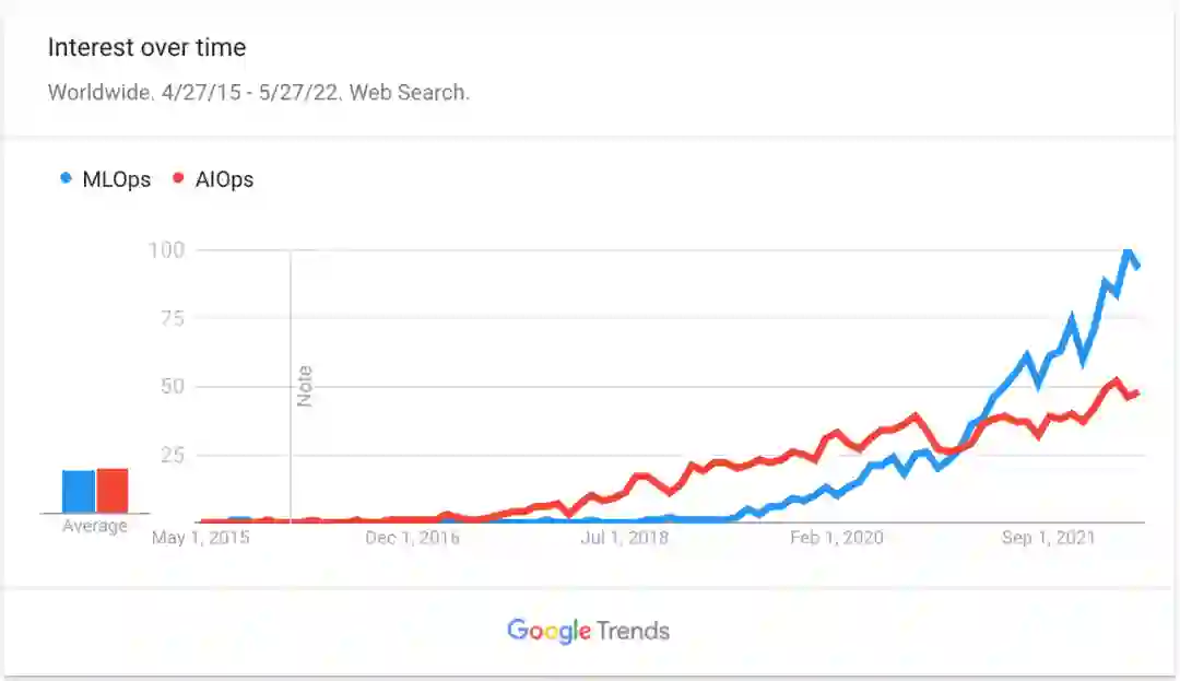 MLOps 和 AIOps 是两个听起来比较相似的术语,用于指代当今行业内截然不同的两个学科。自从几年前引入这些术语以来,Google Zeitgeist 对它们的关注激增,正如谷歌趋势的图表所示。
