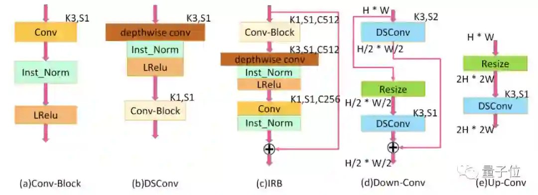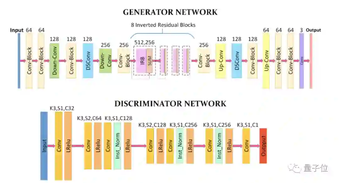 为了有效减少生成器的参数数量,AnimeGAN的网络中使用了8个连续且相同的IRB(inverted residual blocks)。