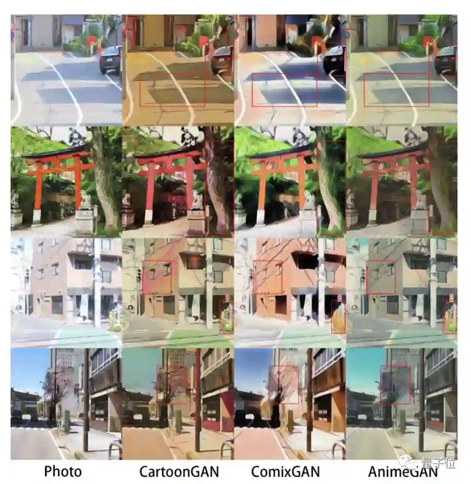 与此前的SOTA方法相比,可以看出,CartoonGAN生成的动漫图像中通常会存在颜色伪影区域(图中红框),ComixGAN生成的动漫图像中通常会存在过度风格化的区域(失去了原始照片的内容,目标纹理难以辨识),而AnimeGAN很好地解决了这些问题。