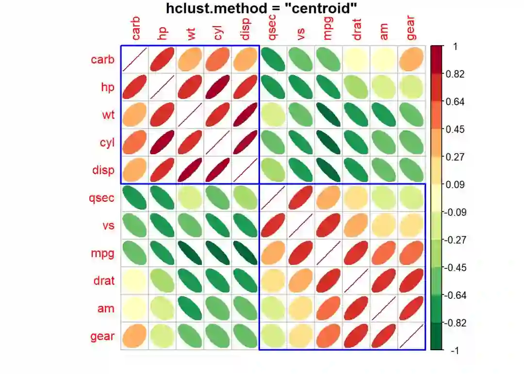 19corrplot(mat_cor, method = "ellipse", order = "hclust", col = palette_2,