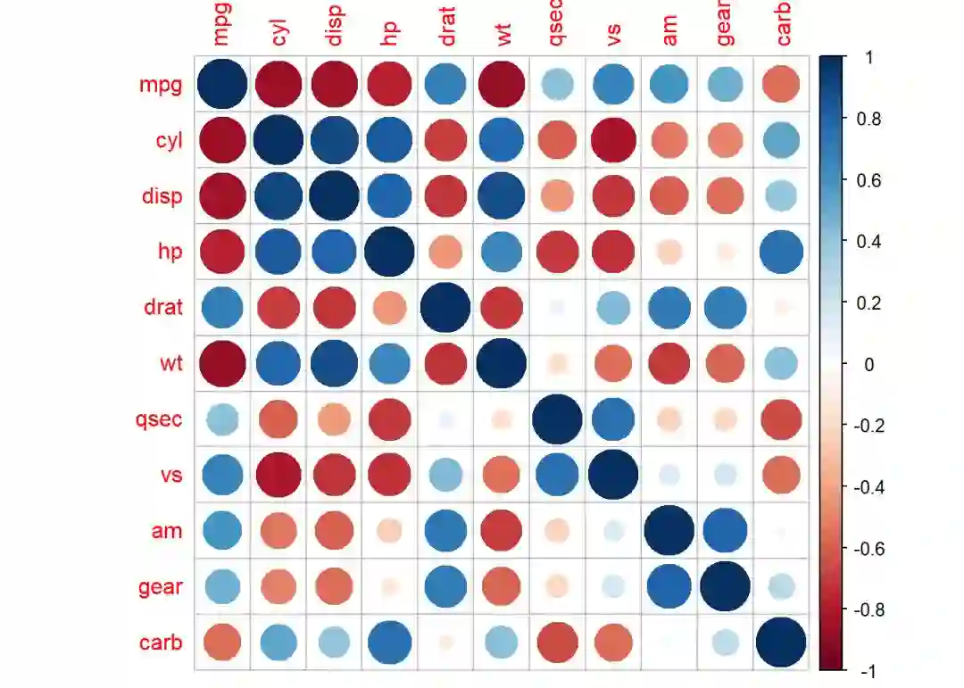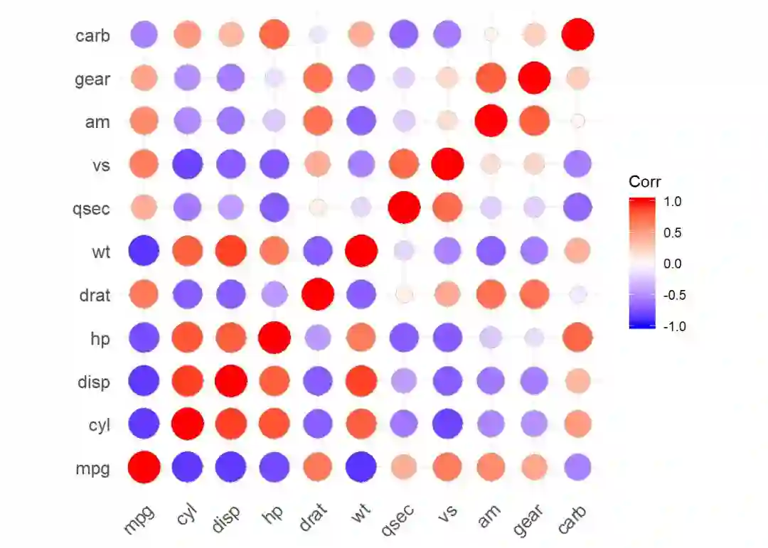 4ggcorrplot(cor(mtcars), method="circle")