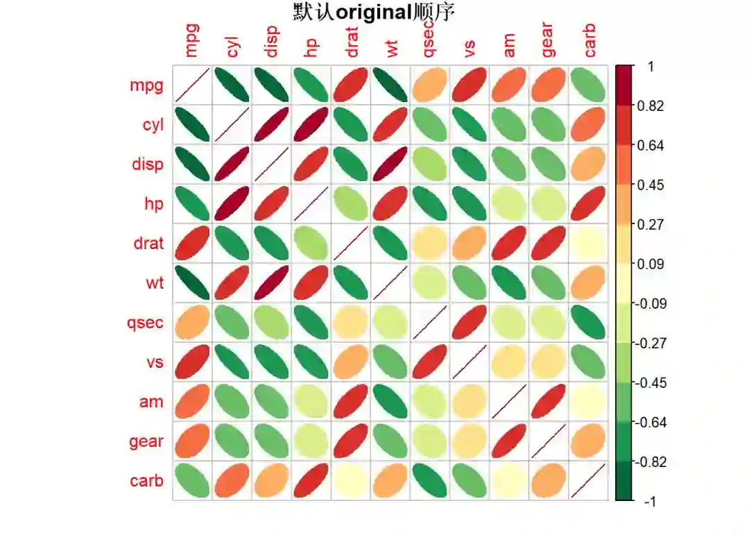 order, 指定相关系数排序的方法, 可以是original原始顺序,AOE特征向量角序,FPC第一主成分顺序,hclust层次聚类顺序,alphabet字母顺序。