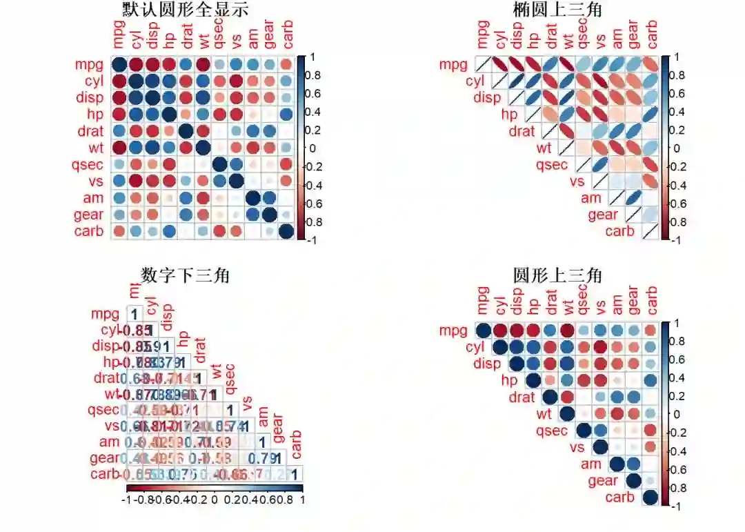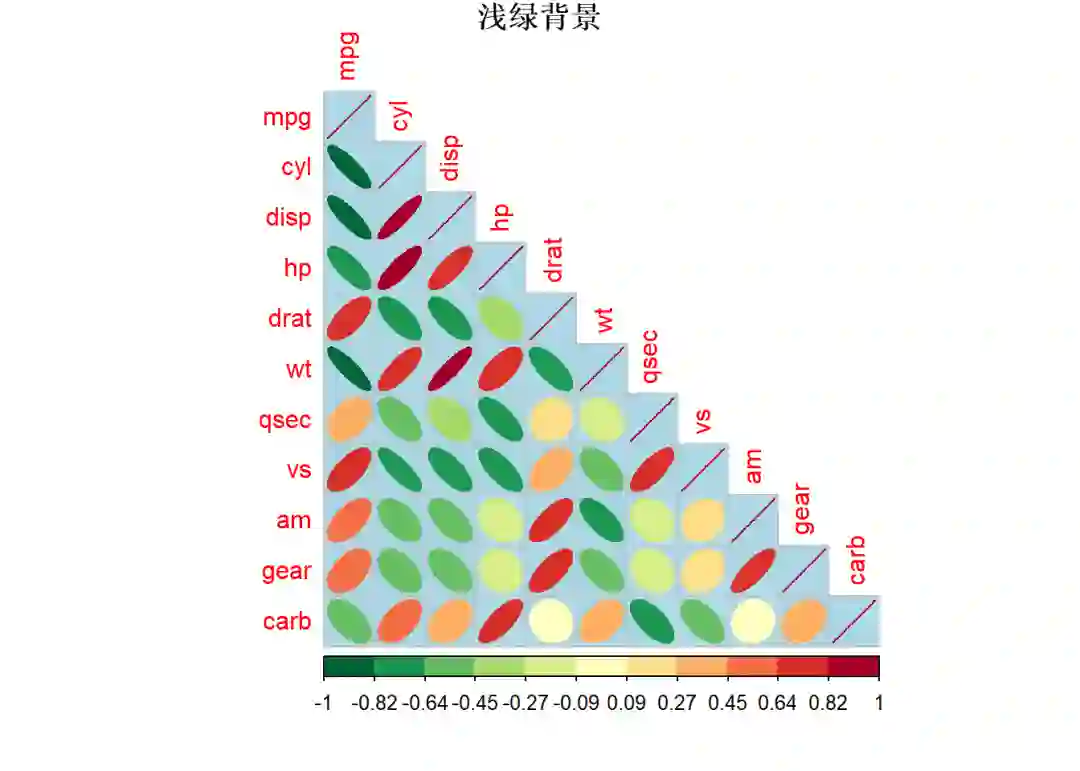 9corrplot(mat_cor, method = "ellipse", type = "upper", title = "椭圆上三角",