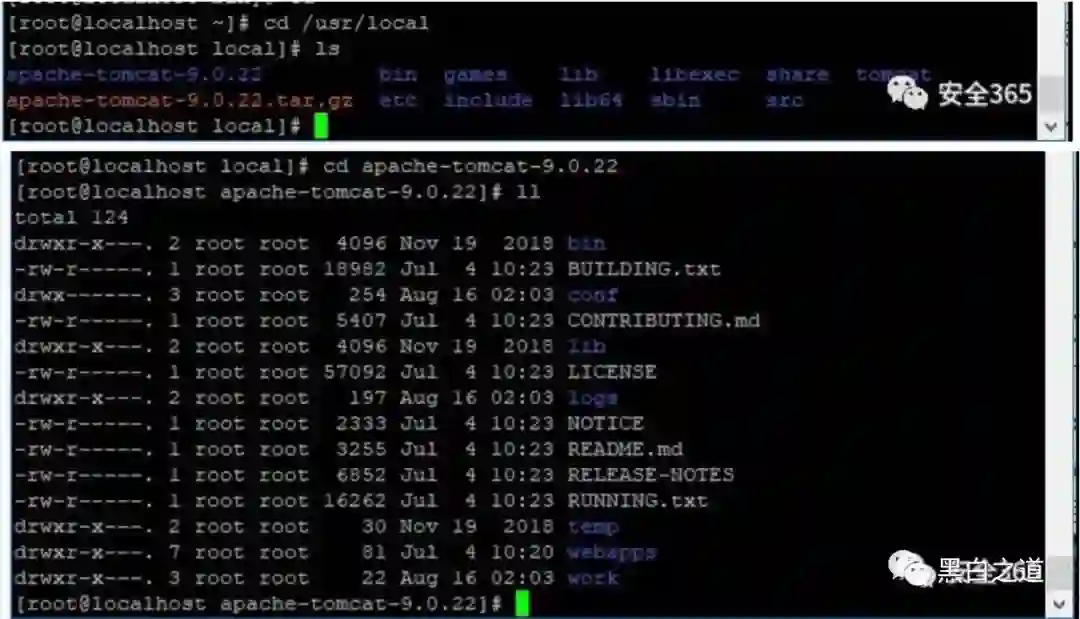 cd /usr/local mkdir tomcatcp apache-tomcat-9.0.22.tar.gz /usr/local/tomcattar -zxvf apache-tomcat-9.0.22.tar.gz解压完成后查看目录: