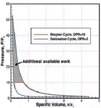 图24 布雷顿(爆燃)循环和爆震循环的P-v图(压比分别为2和10)[2]