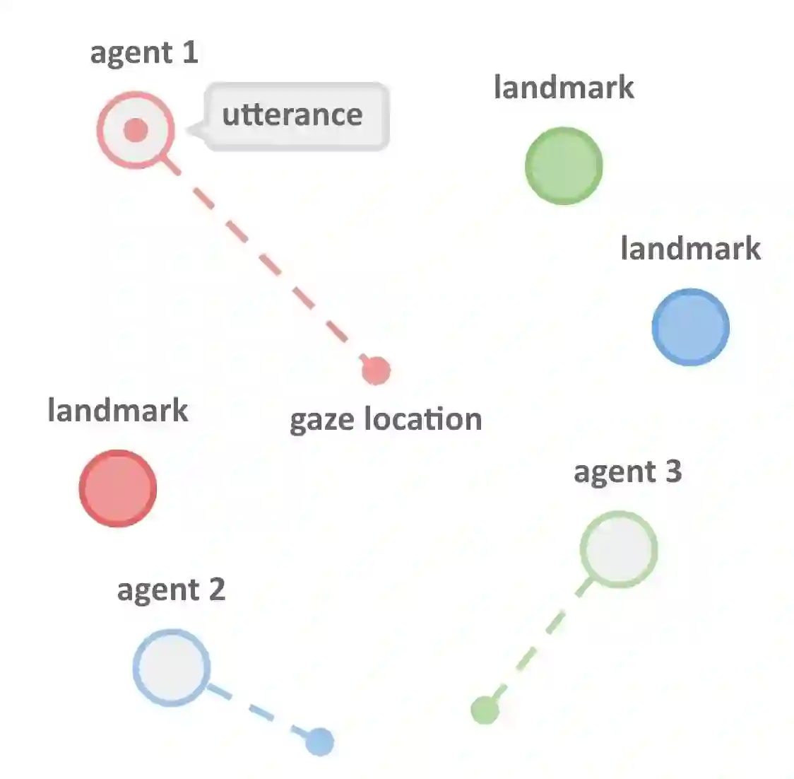 在研究中,人工智能体存在于一个简单的 2D 世界,可以做出移动、观察、与其他人工智能交流等动作。在图中,1号智能体在观察中心点的时候正在说话。