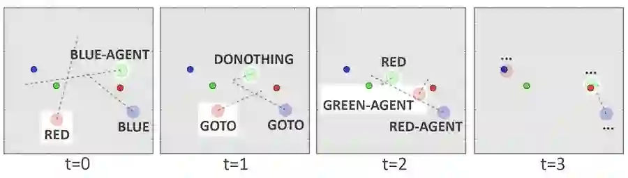 在时间步发展中,t=0 时红色智能体对其他智能体说了一个单词以表示红色界标(图中深红色),随后在t=1 时又说了相当于「去(Goto)」的单词,在 t=2 时它说:「绿色智能体」。绿色智能体听到了这些指令,立即移动到了红色界标的位置。