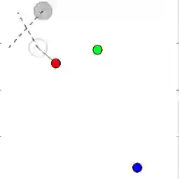 当智能体不能通过文本相互交流,并且必须在模拟环境中执行物理运动时,该训练法同样能运作。在接下来的动图中,研究员们展示了智能体指向点的即时情况或指导其他智能体去目标的情况,在极端情况下智能体会看不见它们的目标。