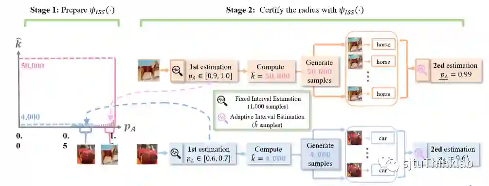 那么现在问题在于,对于每个输入我如何确定该选用多大的采样数。我们这里给出了一种方案:先预设一个理想的采样数 (这个数一般很大,例如 1000,000),我们将在 采样数下得到的 当作理想半径,而我们希望求出最小的采样数使得我们在该采样数下认证半径与理想半径的差小于等于一个定值,这个定值我们表示为 。实际上,这个最小采样数 只与 有关(当 与 给定),于是我们就可以提前计算出一个函数 ,输入 就能得到 。具体的ISS认证过程如下图: