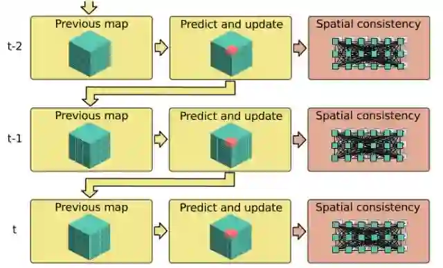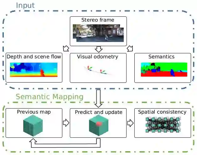 在本文中,作者提出了一种语义建图的方法。该方法增量式地将立体相机的每帧观测融合成时间一致的三维语义地图。与之前的工作相比,作者的方法使用场景流在地图中对动态目标进行传播,而且对于静态目标和动态目标都提供了长期的三维占据以及语义置信度,这就使得尽管单帧观测存在噪声与遮挡,本文也能够对目标进行高级推理。此外,作者还开发了一种基于地图上时间一致的形状、外观、运动和语义等线索来检测目标的方法。