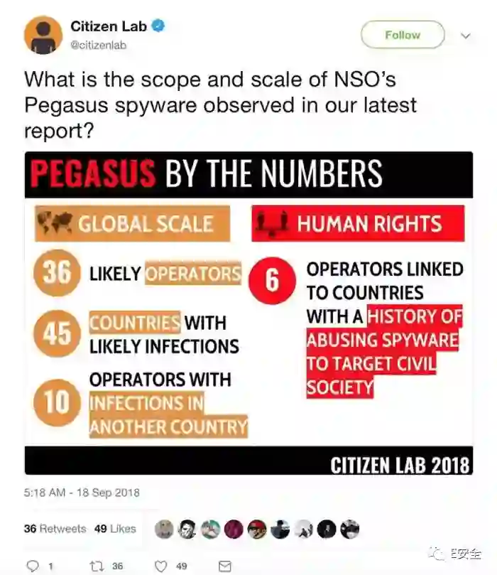 加拿大多伦多大学公民实验室(Citizen Lab)当地时间9月18日发布报告披露,其通过扫描技术发现 Pegasus 手机间谍软件过去两年活跃于全球45个国家,包括美国、英国和加拿大。