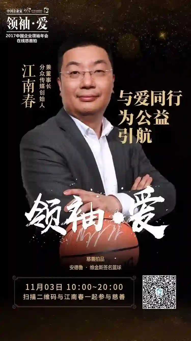 11月3日,由《中国企业家》杂志社主办的“领袖•爱”中国企业领袖年会在线慈善拍卖活动将在库拍APP启动,第一拍就是江南春捐赠的一个有特殊意义的篮球。