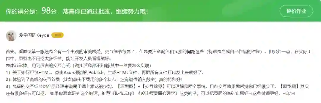 第一次临摹,我有5个复杂的交互设计做不出来,但是当我通过网上搜索,以及听完keyda老师的讲解,我第二次临摹只剩下3个复杂交互做不出来。最后一次临摹开始的时候,我又重新百度了下网上的方法后,3个中的2个被我做出来了,剩下的最后1个在请教黄老师后也做出来了,在这里也要感谢黄老师的耐心讲解,最终我的临摹作业以98分的优异成绩位列第一。