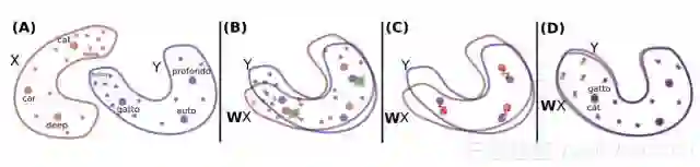 该方法是将输入的两组单词嵌入在单语数据上进行独立训练,并学习它们之间的映射,以便共享空间中的翻译结果。他们使用fastText在维基百科文档上训练的无监督单词向量。以下图片说明了关键的想法: