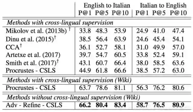 随着词嵌入的成功,跨语言词嵌入的想法也出现了,目标是对齐嵌入空间而不是词典。不幸的是,这种方法也依赖于双语词典或平行语料库。Conneau et al·(2018)提出了一个非常有前景的方法,不依赖于任何特定的资源,且对于多个语言对的次翻译、句子翻译检索和跨语言单词相似度任务上优于监督学习的方法。