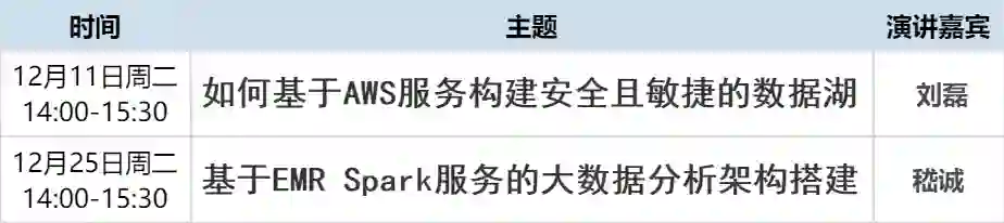 不用担心!针对以上问题,就在 12 月 AWS 在线研讨会,小编给大家带来了两场聚焦于 AWS 在 数据湖 和 数据分析 上的落地与创新实践的免费课程!
