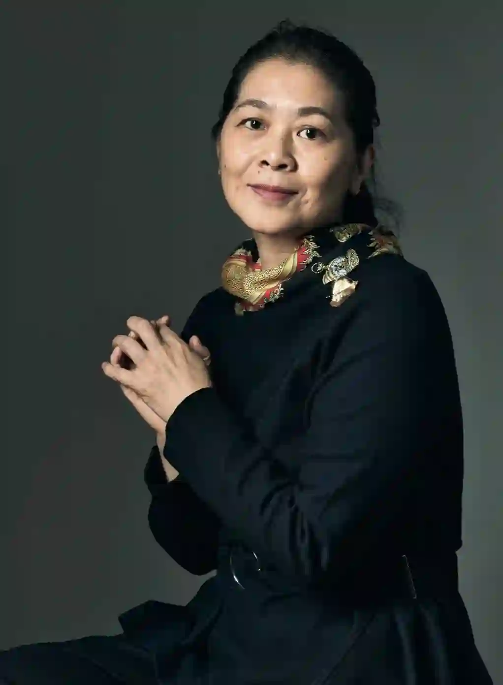 采访第二天要拍照,迟子建带了一个小小的绸面的化妆包,化妆包上绣着几朵小花儿,她依然爽朗地笑着,对着摄影师大呼上当,但仍旧咬牙配合着。这天她穿一套很精致的深蓝色绒面套装,深蓝色是她喜欢的颜色,会让她想到故乡的夜空。脖子上系一条橘色花纹的爱马仕丝巾,丝巾一侧,她还别上一枚金黄银杏叶型的胸针,丝巾和金色胸针点亮了深蓝色的沉闷。