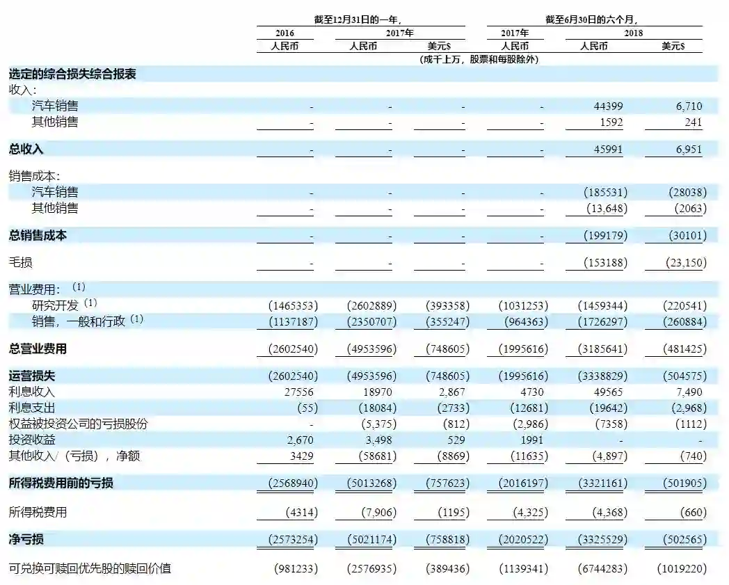 而目前,蔚来有限的现金流几乎都来自于汽车的销售。蔚来此前经历了多次跳票波折,招股书披露了蔚来的真实交付数字,截至2018年6月30日,蔚来汽车销售及其他销售录得收入人民币4600万元,也就是到6月30日蔚来只完成了100辆车的交付。(备注:招股书补充,截至2018年7月31日,蔚来交付了481辆ES8。)根据当前的节奏,李斌日前和何小鹏关于年底交付10000辆车的赌约,很难不让人打上一个问号。