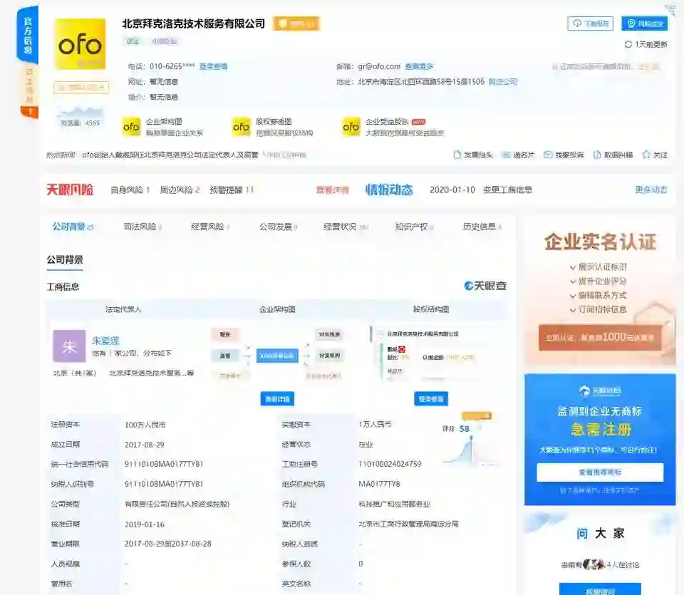 天眼查数据显示,1 月 10 日,北京拜克洛克技术服务有限公司发生工商变更,ofo 创始人戴威退出法定代表人、执行董事和经理,由朱爱莲接任。此外,张巳丁退出监事,由袁雪云接任。北京拜克洛克技术服务有限公司成立于 2017 年 8 月,注册资本 100 万人民币,戴威持有该公司 70% 的股份,为公司最大股东;联合创始人杨品杰和于信分别持股 20% 和 10%,为公司第二和第三大股东。