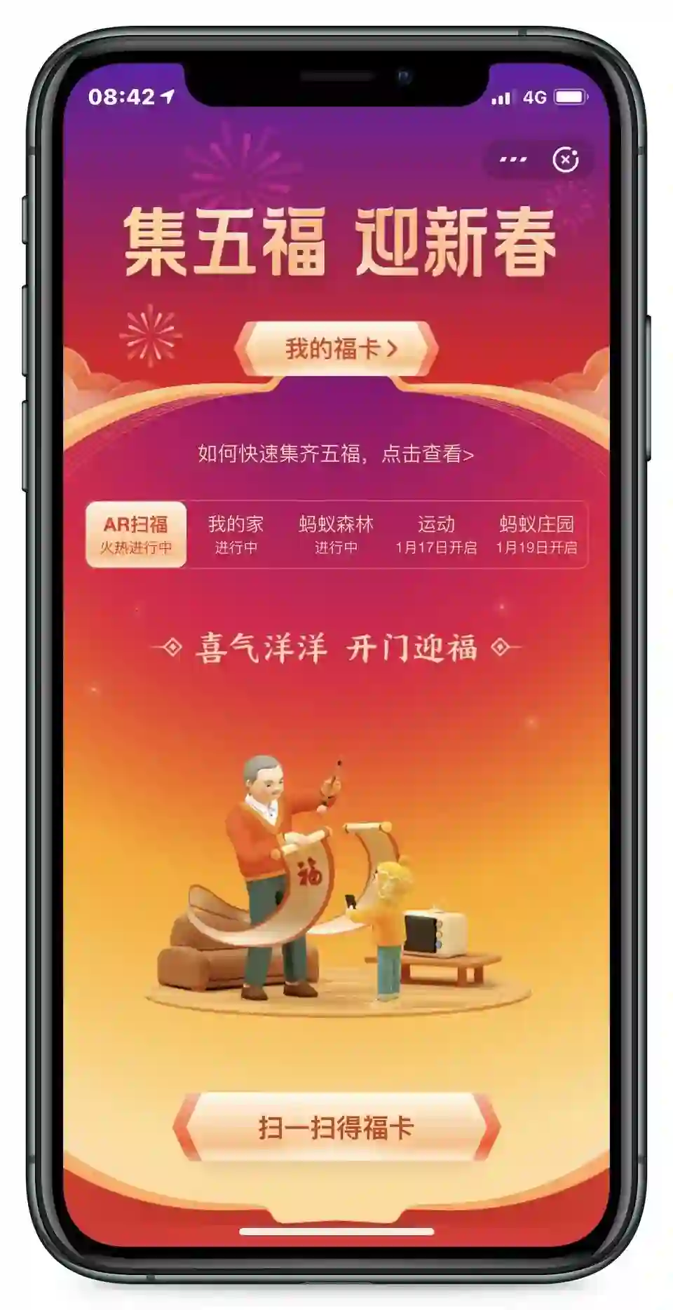 1 月 13 日,支付宝集五福活动正式上线,2020 年支付宝新春集五福依然是「富强福」「和谐福」「友善福」「爱国福」和「敬业福」,但会新增「全家福卡」,拥有此卡,即可有机会抽取「帮还全家花呗」大奖,而「AR 扫福」「森林浇水集福」「庄园喂小鸡集福」「花花卡」「沾福气」等活动也将继续保留。