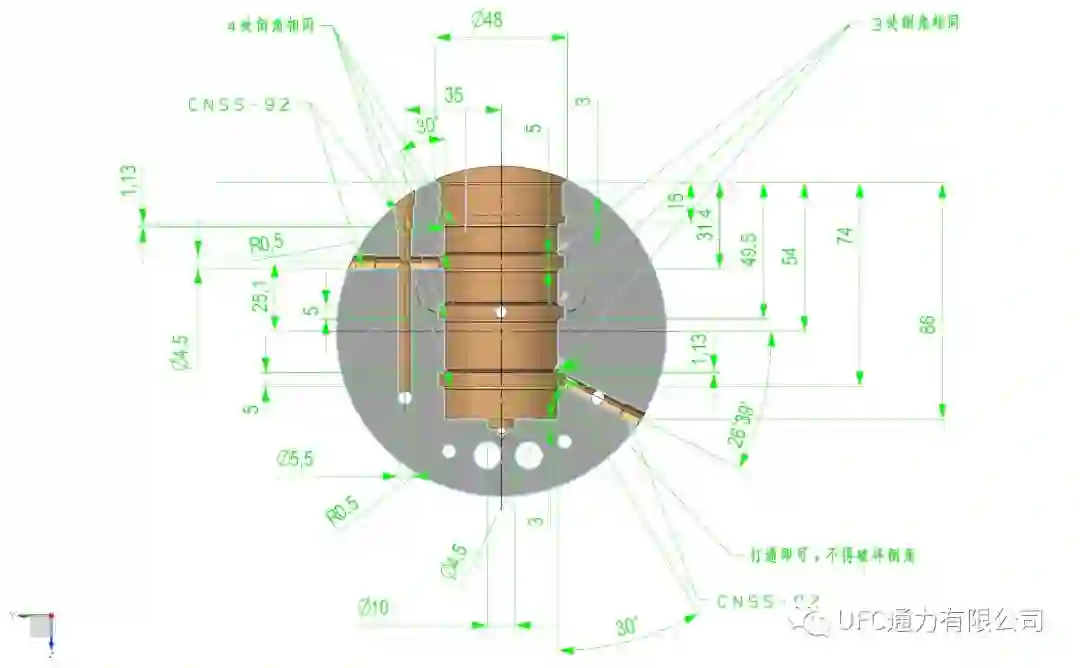 根据基体产品模型及加工特征,初步确定加工工艺和选配车铣钻镗铰等刀具170余把,编制了400余序的加工程序,解决加工中遇到的工艺问题,不断调整修订工艺路线,保证最终一次性完成合格产品。