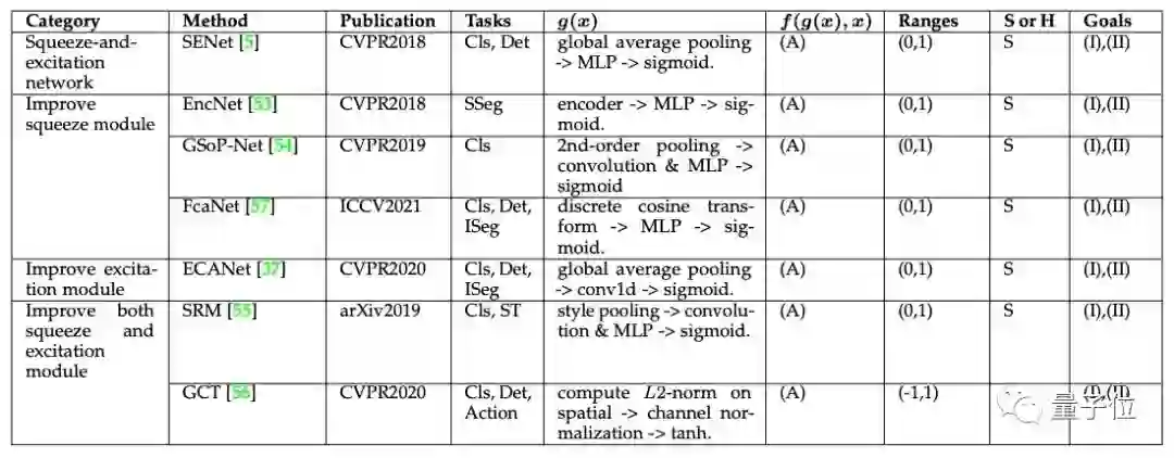 因此,按照类别和出版日期将代表性通道关注机制进行分类,应用范围有分类(Cls)、语义分割(SSeg)、实例分割(ISeg)、风格转换(ST)、动作识别(Action)。