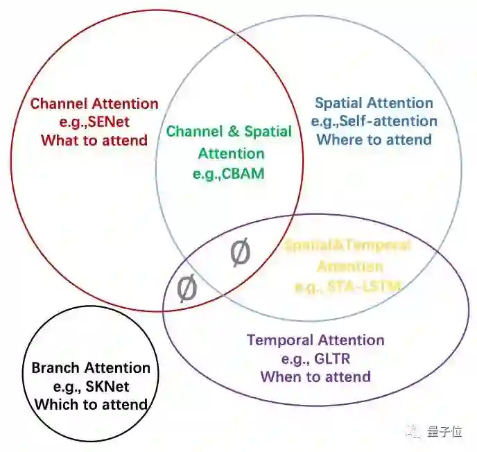 同时,注意力机制也被分为了通道注意、空间注意、时间注意、分支注意,以及两个混合类别: