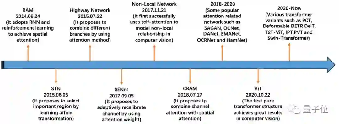 论文首先将基于注意力的模型在计算机视觉领域中的发展历程大致归为了四个阶段: