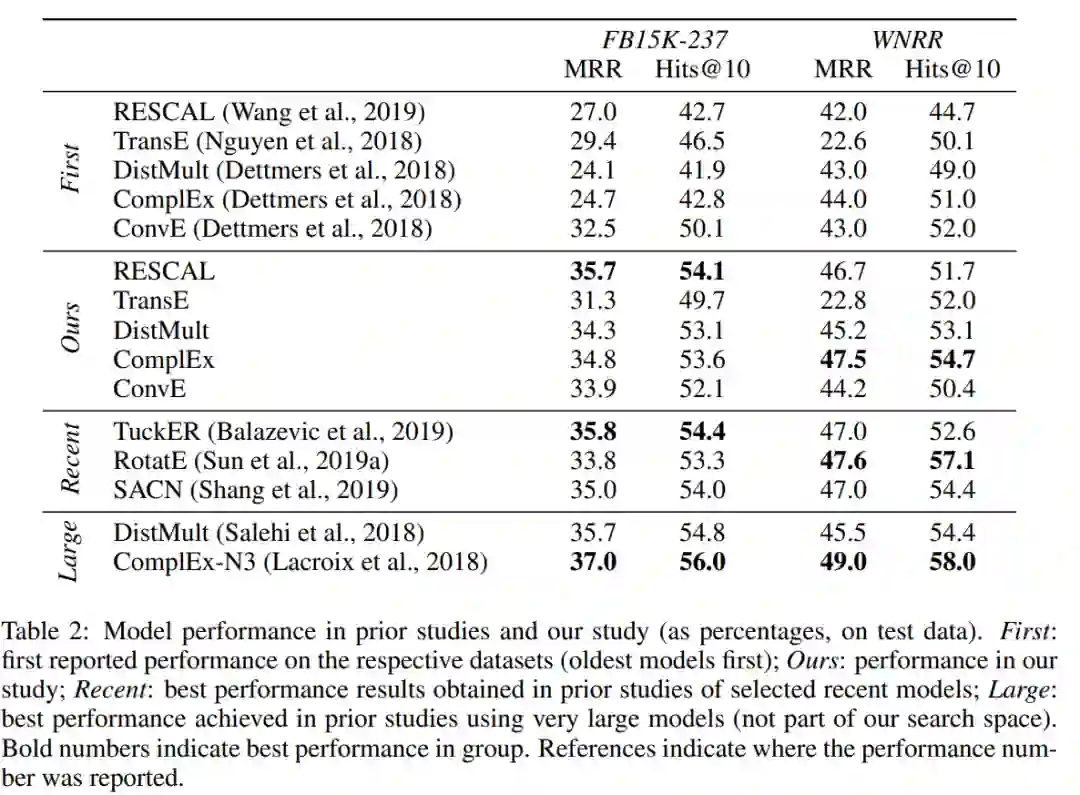 1.模型的Firstreported性能与作者得到的实验性能的对比:(如表2 First)作者发现单个模型的性能差异非常大;在作者的实验中(表2 Ours),许多模型的性能相比First reported有了巨大提升,包括RESCAL, TranE等都达到了相同方法的最佳。