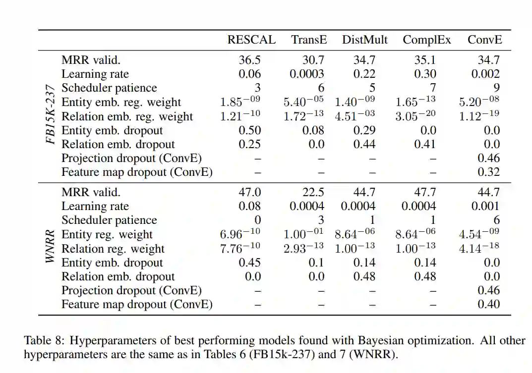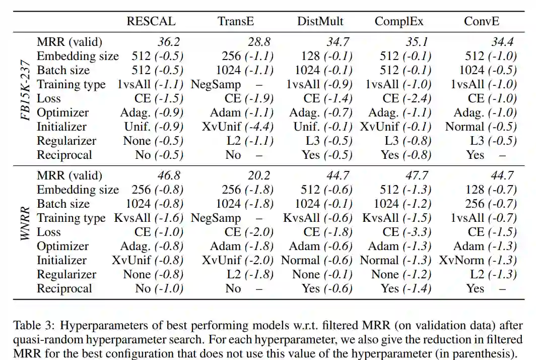 超参方面:作者使用了一个大型超参数空间,用于确保不会遗漏每个模型适用的(前人提出的)超参数设定。实验涵盖了所有主流的训练类型,使用Reciprocal relations,损失函数考虑了MR,BCE,CE,正则化技术则涉及到无/L2/L3以及dropout的全部设定。优化算法包含Adam和Adagrad。作者考虑了128,256,512三种维度的embedding,并且对实体和关系的建立独立权重用于dropout和正则化。(按照作者的描述,目前尚未有一个工作涉及到使用如此大的超参数搜索空间)