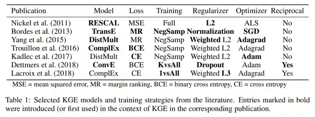 前人的工作中已经提出了很多的超参数设定,包括不同的初始化模型参数的方法,不同的优化算法,包括学习率和批量规模等优化参数,负例的规模,实体和关系的正则权重等。