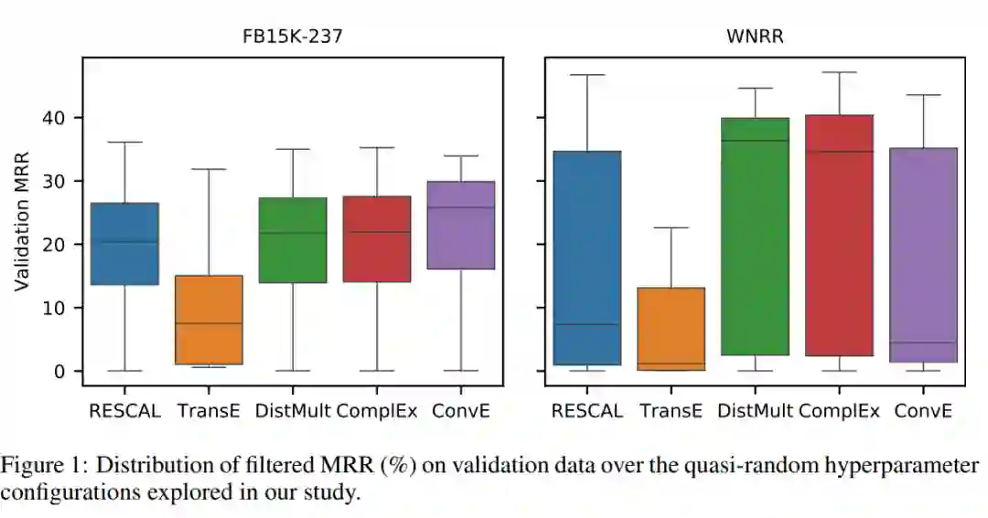 图1描述了各个模型在不同超参数设置情况下的MRR验证得分分布(可以看到不同配置情况下模型的性能上下限非常明显,而大多数模型的性能上界接近)