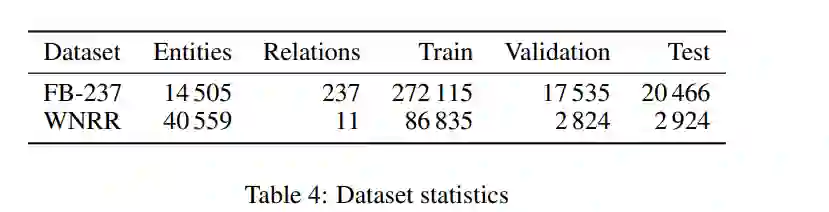 数据集方面:作者使用FB15K-237(Freebase的一个子集),以及WNRR(来自WordNet)。使用这些数据集的主要理由是:它们被许多前人工作所使用;它们具有难度(专门面向多关系链接预测);相关模型性能上具有多样性;数据规模适用性。数据集的统计信息如下表: