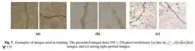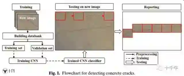 回到这篇文章,Cha老师首先掌握了332张用佳能单反相机拍摄的高清混凝土结构表面裂缝照片,他把这些照片分为两组,一组是277张分辨率为4928x3264的照片作为“训练组”,一组是55张分辨率为5888x3584的照片作为“验证组”。