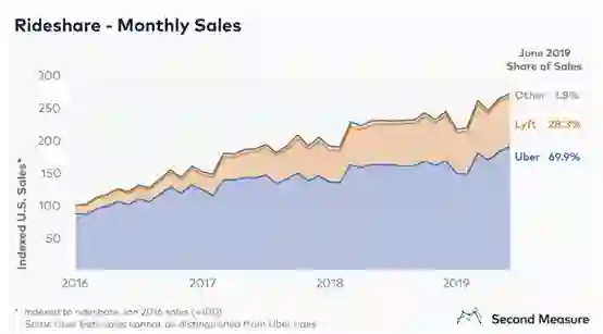 (Uber、Lyft市场份额情况,图片来自Second Measure网站,版权属于原作者)