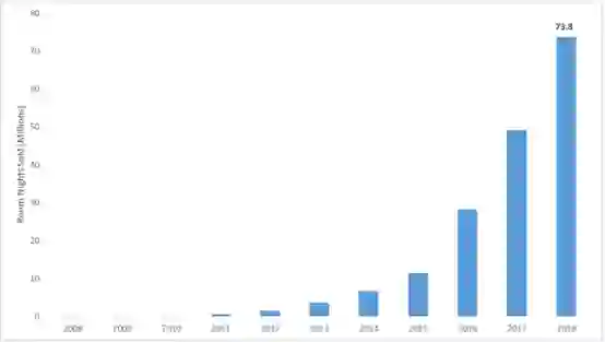 (2008-2018年Airbnb在美国市场的住宿量增长,图片来自Hotel online网站,版权属于原作者)