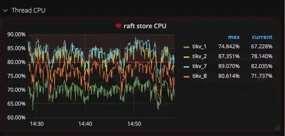 这样就产生两种写入操作:一个是写Raft log,一个是把键值对写入数据库。为了在TiKV中独立地执行这两种操作,我们创建一个raftstore进程,它的工作是拦截所有Raft信息,并写Raft log到硬盘中;同时我们创建另一个进程apply worker,它的职责是把键值对写到数据库中。在Grafana中,这两个进程显示在TiKV面板的子面板Thread CPU中(如下图所示)。它们都是极其重要的写操作负载,在Grafana中我们很容易就能发现它们相当繁忙。