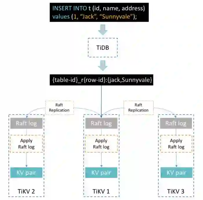 在此过程中,有 3 类关键的过程要处理:转换 SQL 为多个键值对、Region 复制和二阶段提交。接下来让我们深入探讨各细节。