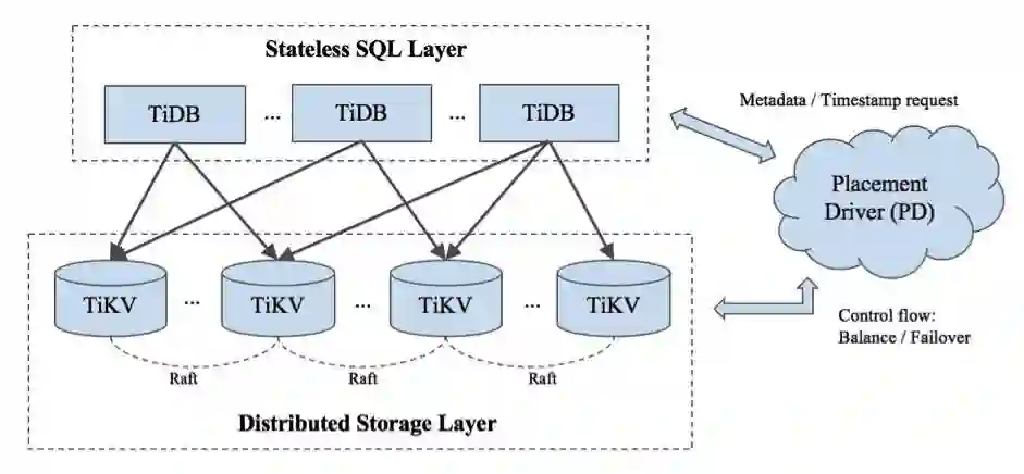 TiDB 是开源的混合事务处理/分析处理(HTAP)的 NewSQL 数据库。一个 TiDB 集群拥有几个 TiDB 服务、几个 TiKV 服务和一组 Placement Deiver(PD)(通常 3-5 个节点)。TiDB 服务是无状态 SQL 层,TiKV 服务是键值对存储层,PD 则是管理组件,从顶层视角负责存储元数据以及负载均衡。下面是一个 TiDB 集群的架构,你可以在 TiDB 官方文档中找到每个组成部分的详细描述。