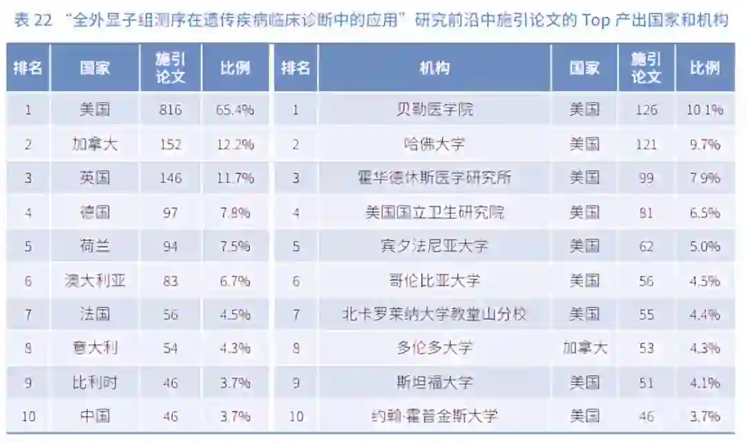 首先,最直观的结论是:中美科研,在前沿领域上的实力差距实在太大了!在绝大多数前沿研究领域,美国都是毫无疑问的NO.1,对其他国家形成了恐怖的碾压态势。比如说,在临床医学领域的“全外显子组测序在遗传疾病临床诊断中的应用”领域。