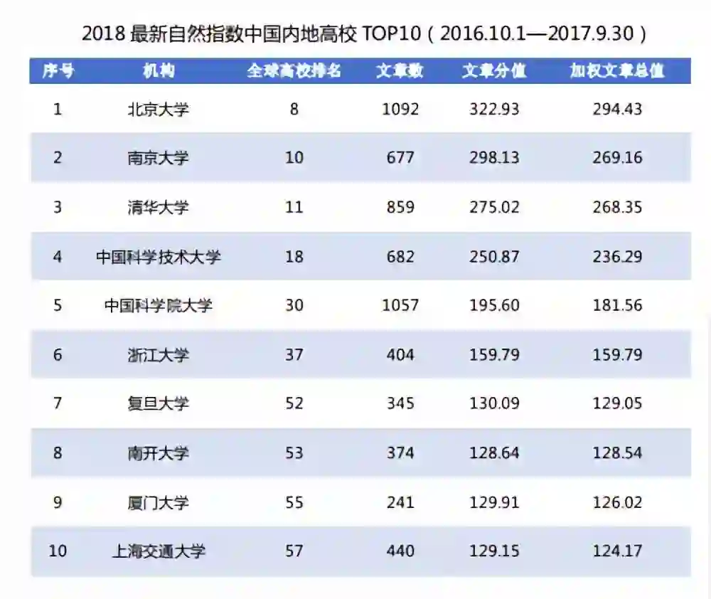 2018年公布的最新自然指数显示:美国发表的论文总数为23849,加权文章总值为15029。中国发表的论文总数为10212篇,加权文章总值为6975。